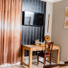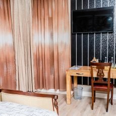 This room is named after a flower called Heather (Calluna vulgaris) which is an evergreen branching shrub. Heather flowers bloom in late summer. Wild species of Heather flowers are usually in purple or mauve shades. The flower’s various cultivars come in colours ranging from white, through pink, a wide range of purples and reds. This queen size bedroom has been decorated in the colours closest to the Heather flower which provides everlasting memory and tranquillity leading to interesting effects. This spacious bedroom overlooking the rainforest-covered mountain has a separate private en-suite featuring toilet, shower and bath with a generous vanity unit. The room is fitted with a bar fridge to provide all that is desired for a change of scene away from home.